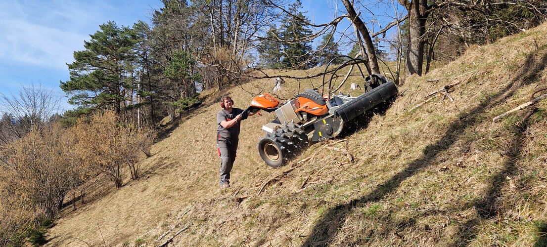 Seit 2024 wird am Kobelhang in Füssen eine Beweidung über Landschaftspflegemittel gefördert. Die Fläche ist in Teilbereichen sehr steil und aufwendig zu bewirtschaften. Aufgrund dieser schwierigen Verhältnisse konnte die Fläche schon seit längerem nicht mehr ausreichend gepflegt werden. Dies führte dazu, dass die Fläche stark verfilzte und der Blütenreichtum rückläufig war. In einigen Teilbereichen sind jedoch noch Magerrasenreste vorhanden, die uns hoffen lassen, die Fläche wieder aufwerten zu können. Ende Februar wurde eine Weidenachpflege durchgeführt, damit die Schafe auch die steilen Bereiche wieder besser abfressen.